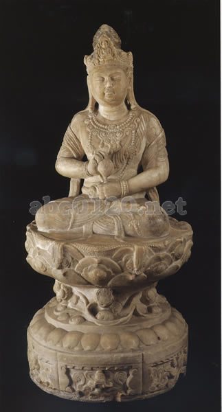 西安景龍池の廟に伝来したといわれる白大理石の美しい観音像。景龍池は、玄宗(在位七一二~七五六年)が開いた宮殿(興慶宮)内の池の跡にあたり、現在、その付近は興慶宮公園となっている。光背を欠くものの、像本体ばかりでなく、装飾・持物・台座の各部にいたるまで、ほとんど損傷がみられず、保存状態はきわめてよい。表面の彩色は、大半が剣落しているが、頭髪にその痕跡が認められる。