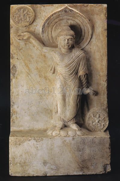 直方体状の白大理石の一材から像を浮彫し、下方に銘文を刻出する。中央に大きく表わされたのが釈迦如来で、偏袒右肩に衣を着し、宝珠形の光背を負い、右手を側方へ高く上げて掌を上に向け、左手は垂下して掌を下に向け、蓮華座に立つ。丸々とした顔や幅広の体、さらに豊満な腿といった各部に見られるように、量感に富んだ重厚な造形を主体とするが、棒状でか細い両腕の表現は、いささかおざなりともいえる。八世紀半ば前後の作風に相当しようか。