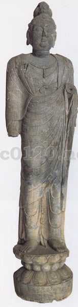 如来のように大衣をまとい、上体をわずかに右方へ傾け、右手を垂下して左手は屈臂し(左右の手首先は欠失)、蓮華座の上に立つ。