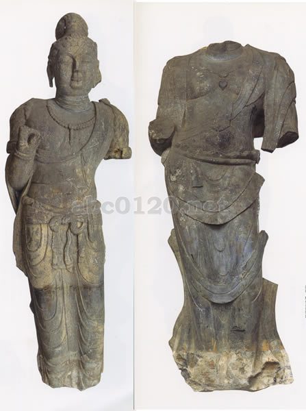 この二躯は、銘文がなく、像容からは尊名を特定できない。腰を軽くひねった姿態は、大海寺址出土の菩薩像の特徴の一つであり、大きさや肉身ないし衣文の表現なども同一の系統に連なるものである。一つは、左腕の大半と足首から先を欠き、一つは、頭部と両腕の半ばから先および足首から先を欠失し、天衣にも欠損がある。現状では、こうした損傷と表面の荒れのために、画像とも見映えをかなり損なっているが、当初の姿を復元的にみれば、大像ゆえに、圧倒的な存在感をもち、寺院の堂宇の中に整然と居並んでいた様は、さぞ壮観であったことであろう。出所:唐の女帝・則天武后とその時代展1998