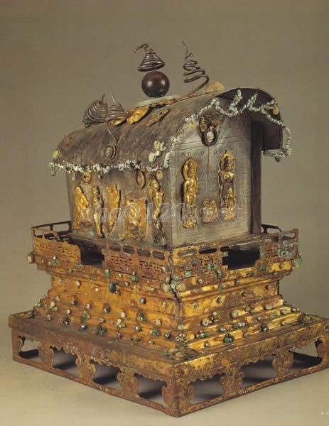 丈高い台座は、青銅製鍍金になり、真珠・緑松石・ガラスなどが貼り付けられている。棺・槨・台座とも、贅が尽くされた華麗な荘厳の様をみせ、舎利に対する厚い信仰のほどを教えてくれる一具である。