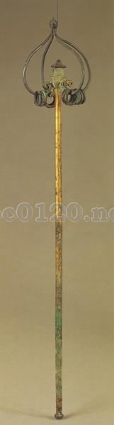 本品は、慶山寺塔下の主室前方に置かれていたもので、大きさは実用に適さず、舎利を供養するために納置されたものと思われる。柄は、青銅製で、八角に成形されたうえで鍍金がほどこされ、頂には塔形の部位が差し込まれている。頭部は、針金状の銀棒を曲げて成形し、頂に宝珠形の金具をかぶせ、螺旋形に作った基部を柄の塔形の下に差し込み、固定している。比較的単純な形ながら、細部まで丹念に作り込まれた精作である。また、頭部のみ銀製となるのは、この種の遺例の中では非常に珍しい。出所:唐の女帝・則天武后とその時代展1998