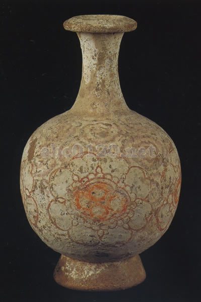 宝相華文長頸瓶は、慶山寺塔下の主室前方から出土した陶磁器の中の三例(鉢・盒・宝相華文長頸瓶)の一つ。粗い胎土をもつ紅陶の一種で、水瓶と同類の器である。成形はいささか粗放になるものの、表面には、白土を下地として、宝相華文(朱色)と雲文(紫色)を描く。前者には淡青・褐色などの彩色と金箔をのせていたようで、当初は彩り豊かに仕上げられていたと推測される。