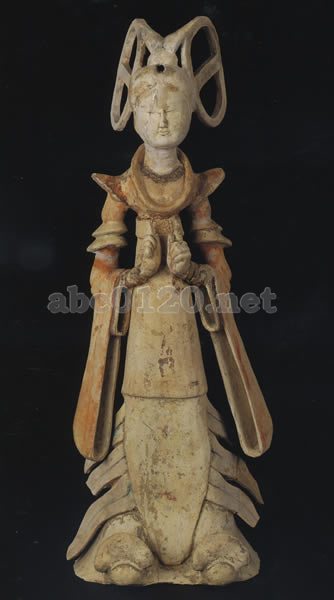 服装はあまり類を見ないもので、環状に大きく結い上げた髻や、人差し指を立てて腹前にそえる両手の構えなども独特である。舞人を表現したともいわれるが、通例の女子俑とは別の特殊な意味合いがこめられたものかもしれない。