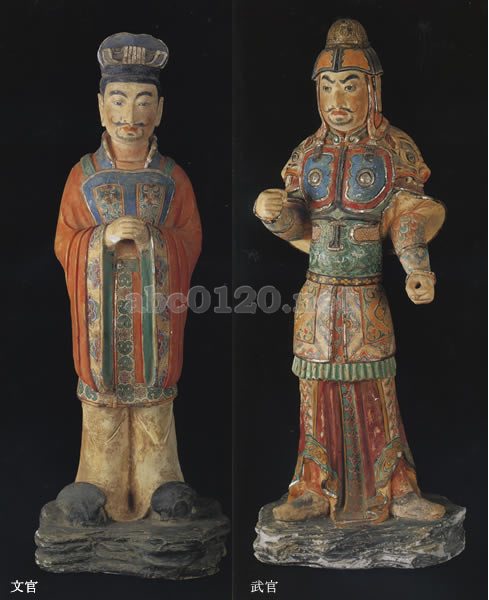 いずれも、灰陶に彩色を加える技法は同様ながら、表情や服制にみられるように、文・武の対比を鮮やかに演出するとともに、美麗な装いには、平穏な世情を享受し始めた、高宗(在位六四九~六八三年)の治世の気分が色濃く反映されている。
