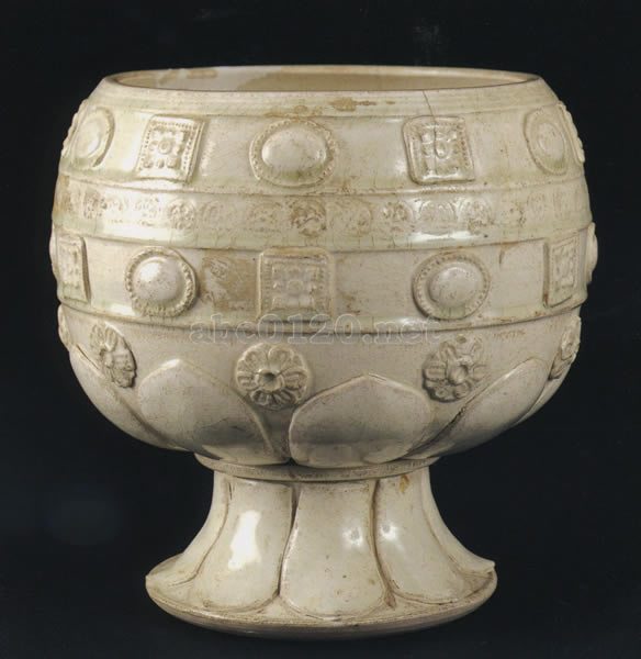 口縁や器側に巡らされた突線(弦文)や、宝石などの象嵌を想起させる貼花の様は、金属器を念頭に置いて制作したことを物語っていよう。これまでのところ類品を見ず、用途は明らかでないものの、唐時代(六一八~九〇七年)初期の気分を色濃く残した珍奇な遺例である。出所:唐の女帝・則天武后とその時代展1998