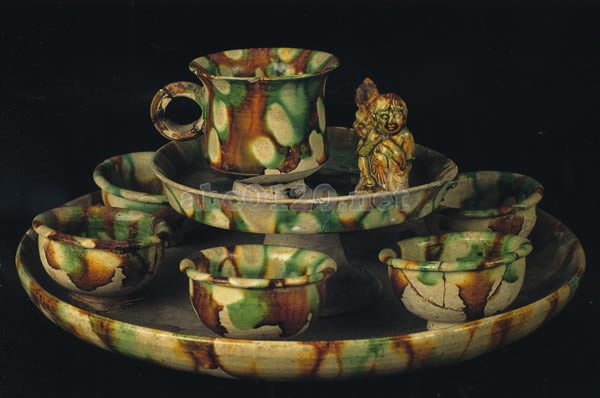 客をもてなすためのセットを三彩で作ったもので、金属や青磁などの類品も散見されるが、二種の杯を伴うことや、人物形の置物が添えられているのは珍しい。出所:唐の女帝・則天武后とその時代展1998