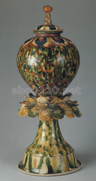 壺は、肩から胴にかけてふくよかに張り出し、裾にかけてすとんとすぼまり、いわゆる万年帝(万年の糧を蔵するという意)の形に近い。蓋は、上面が盛り上がり、その中心に、塔の相輪状に丈高く作られた鈕がつく。壺の肩と蓋の上面さらに台の下部には、蓮弁らしき文様が三彩・釉で描かれる。蓮華座は三重の蓮弁からなり、各蓮弁には、それぞれパルメット風の葉文が浮彫風に表わされている。台は中空で、その上部には、側面が上下数段に面取りされた鉢形の受けが設けられ、その上に蓮華座がのる。