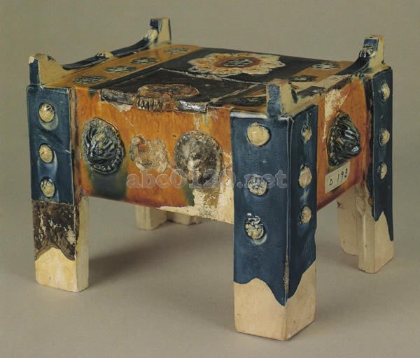 上面にみえる宝相華文や六弁の花文はすべて印花になり、側面の獣面と足の花文は型抜きした凸文を貼り付けたものである。損傷や亀裂が散見されるものの、藍釉・褐釉と、白袖あるいは胎土の白色との対比が鮮やかな一器である。出所:唐の女帝・則天武后とその時代展1998