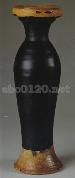 やや粗く、淡い褐色をした胎土上に、首から胴裾にかけて黒釉がほどこされ、口縁と胴下端および底裏(平底)が露胎となる。ただし、口縁は、 一度釉をかけた後、それを剥ぎ落として胎土を露出させたものである。こうした処置には、蓋をのせる用意や、金属製の覆輪を付ける処置、あるいは木の葉などで封をするためなど、いくつかの使用法が想定されよう。