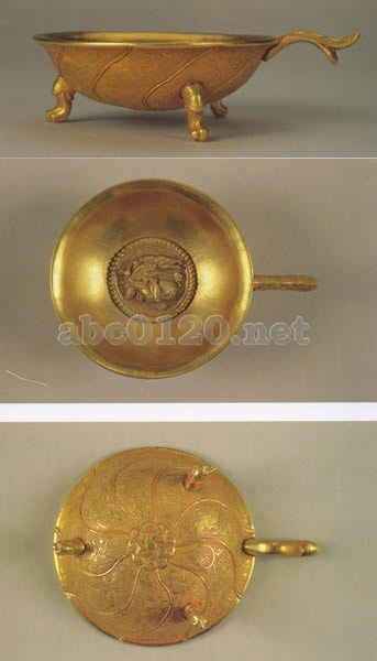 三足がつくことから、物を煮たり酒を温めたりする容器(鐺)に比定されているが、比較的軟質かつ貴重な素材が用いられていることや、外底に緻密な文様が表現されていること、また、把手が備わることなどからすると、薬湯や貴酒あるいは佳味な羮(スープ)などを容れた飲器の一種とも考えられよう。出所:唐の女帝・則天武后とその時代展1998