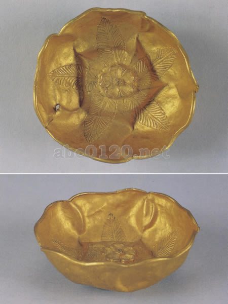 花葉文五花形杯は五花形に作られた金製の杯。地金の色調は赤みがかり、純金に近い系材が用いられたと思われる。各所に鬆(気泡の痕)が散在することからすると、高台を含めて、鋳造になると推測されるが、外側面の窪みには工具の打痕と刻線が認められ鋳造後に、 一部を鍛造して仕上げたようである。内底にある五弁の花文と棗椰子の葉かと思われる五方へ伸びた葉文は、その様態をみると、器の裏側から、打出しと線刻によって表現されたとおぼしい。 一方、口縁の内側の玉縁状の部位は、鋳造になるものと見える。
