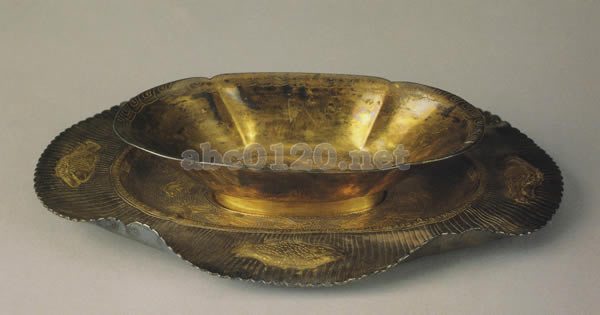 隋・唐・五代|金銀・玉器|>双魚文四花形杯・双鴻双魚文荷葉形托 |