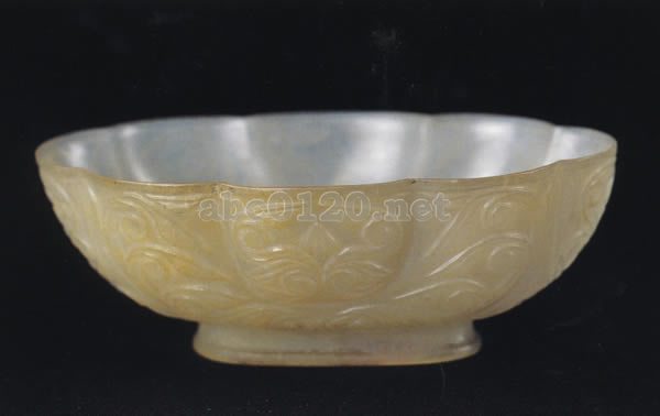 わずかに黄味がかった白玉を削り出し、研磨して八曲の杯とし、底には楕円形の高台を作り出す。闘獣文八曲杯のような、西方の八曲杯に倣った作例であり、この種の杯は、形を変えながらも、唐時代(六一八~九〇七年)を通じて愛好された。側面には、凸曲した区画の中に、それぞれパルメット唐草文を浮彫風に表現している。整形時の凹凸や粗めの研磨の条痕によって、かえって玉の暖みが高められている。