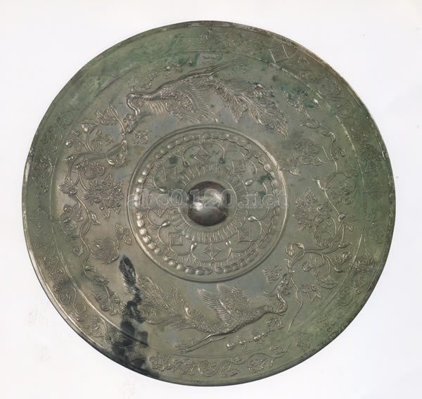中国の青銅鏡は、南北朝時代(四三九~五八九年)に一度衰退するが、隋(五八一~六一八年)・唐(六一八~九〇七年)には、再び盛んに制作されるようになった。ただし、その復興にあたっては、従来の伝統的な陶製鋳型によらず、おおむね、蠟で原型を形作る蠟型鋳造法が採用された。蠟型鋳造の場合、平らに作った原型(鏡胎)の上に、眼の塊を置いて彫刻したり、型抜きした部位を貼り付けたりして文様を成形したため、神仙、人物、禽獣、蝶鳥、草花木、山水、楼閣、八卦など、多種多彩な表現が可能となった。