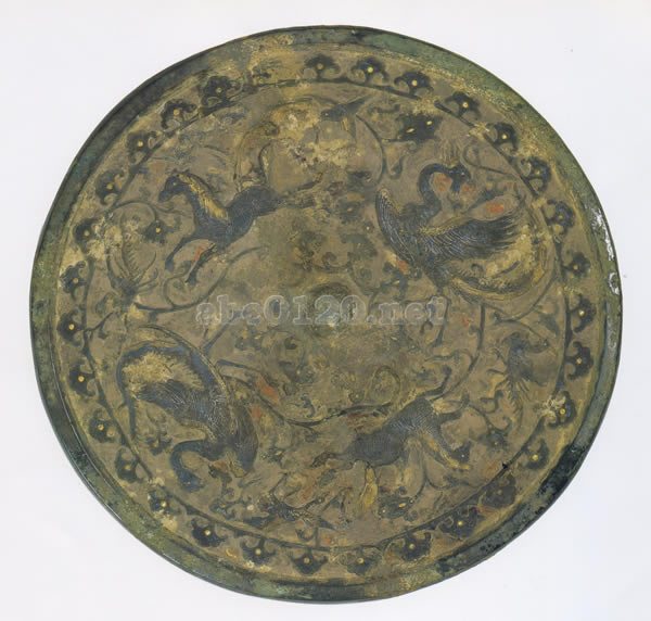 鳳凰の肢体の表現などは、双鳳宝相華文鏡と比べると、やや生彩を欠くものの、この種の数少ない遺品の一つとして、なお注目に値しよう。二片に割れていたものが、中央部で接合、補修されている。出所:唐の女帝・則天武后とその時代展1998
