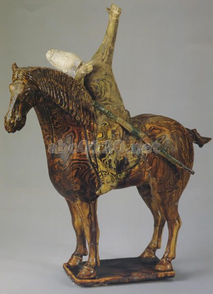 古をかしげて立つ馬の背で、男が、上体を右方へ傾けて仰向き、両手で弓を引き絞る。弓矢は失われているが、上空に飛ぶ鳥を騎射しようとする瞬間を見事に表現した俑である。拡徳太子墓からは、数百体にものほる騎馬俑が出土して注目を集めたが、これは、それらを代表する作例として、よく知られている。