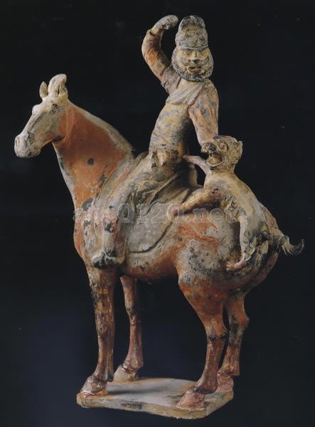 人物、馬、猟犬とも、表情は活き活きとし、均整のとれた肢体には躍動感があふれ、庸時代盛期の写実的な作風の神髄が具現された佳品といえよう。出所:唐の女帝・則天武后とその時代展1998