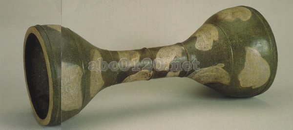 鼓胴は、西方から中国へ伝来した打楽器の一種で、紐によって首からさげ、腹の前で打ち鳴らしたものである。本来、木製皮張りが主体と思われるが、唐時代(六一八~九〇七年)には、本器のような陶磁製品も制作された。その影響は日本にも及び、正倉院宝物中には、奈良三彩の作例が現作している。