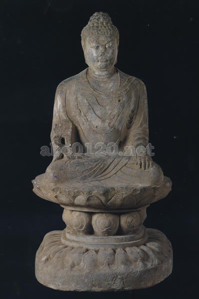通肩に衣をまとい、左掌を伏せて膝に置き、丈高い蓮華座に坐る。頭部はわずかに角立つものの、頬はふくよかで、伏した目と、ほどよい大きさの鼻と口がおさまった表情には、威厳が感じられる。両肩が張り、胸が分厚く、上体はがっしりとしているが、腹は引き締まり、手足はのびやかで、全体に均整のとれた造形を示す。衣文は単調ながら、体に密着する衣の様態には、なお自然さを残している。台座の上下の蓮弁を、幅広で少し偏平なものと、子弁がこんもりと盛り上がった肉厚なものとに作り分けていることには、制作に対する周到な配慮を看取することができよう。台座の底裏が平らに成形されていることからすると、石窟内部の床にそのまま置かれて祀られていたものかもしれない。