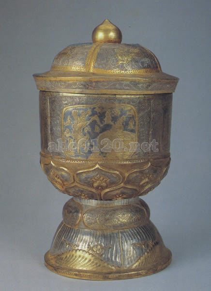 隋・唐・五代|金銀・玉器|>人物禽獣文高脚香盒 |