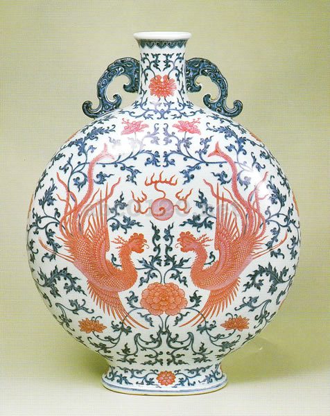 青花胭脂紅双鳳文扁壺 2009年2月21日更新