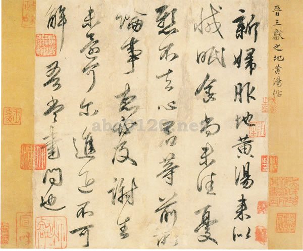 地黄湯とは漢方薬の一種であり、これはその薬についての尺牘である。王献之(三四四―三八八)の真跡といわれるものは王羲之(三〇三―三六一)同様伝存しないが、墨跡本として伝世するものが数種あるといわれ、その一つにこの地黄湯帖があげられる。柔らかさとしなやかさとを併せもつ落ちついた書風で、本文六行の構成をうまくまとめあげている。もとは宋の内府に珍蔵され、高宗がこれに題簽を付した。『淳化閣帖』巻第十所収。その後、賈似道の手にわたり、明代に入り文徴明(一四七〇―一五五九)、王寵、文彭(一四九八―一五七三)が所蔵し、清代に至っては孫星衍、呉栄光、羅振玉所蔵の後、明治四十四年(一九一一)十二月三日、文求堂を介して中村不折(一八六六―一九四三)の有に帰した。巻末に文彭、常生、成親王、英和ら六家の観記や跋がある。呉栄光はこれを手に入れた際、自らが撰輯した集帖である『筠清館帖』に刻入している。 出所:書の至宝-日本と中国2006