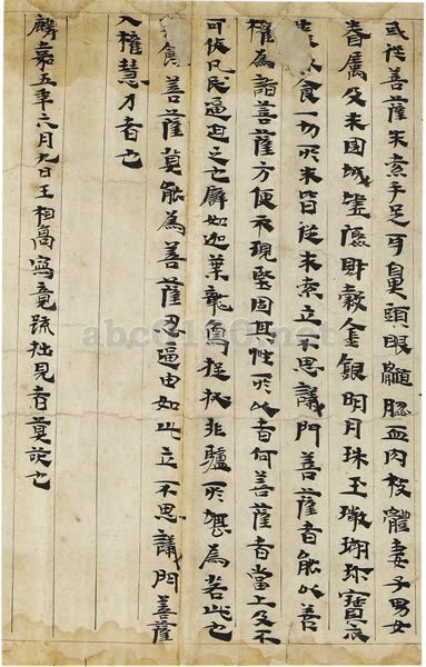全十葉(紙)で、毎葉二十七行二十三字からなる。『維摩経』は正式には『維摩詰所説経』といい、『維摩詰経』ともいう。この巻は巻首が残欠し、『維摩経』のうち『菩薩品第四』など三品、合計六千五百余字が書かれている。巻後の款識には「麟嘉五年六月九日王相高写竟。疏拙。見者莫笑也。」とあり、現存する写経の中でも比較的早期に属するものである。王相高の名は史伝にはみえないが、その小楷の端正謹厳にして、 一筆も疎かにしない書きぶりから、書の修練を積んだ当時の写経生と思われる。 出所:書の至宝-日本と中国2006