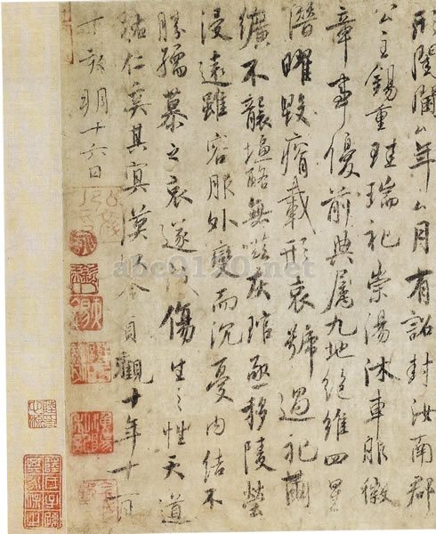 十八行、全二百二十二年からなる行書の墨跡本である。文字の結構は智永の「千字文」に似て、王羲之(三〇三―三六一)の「蘭亭序」を彷彿とさせる。その書は温かく潤いがありながら遒勁で、字姿も秀でている。内容は唐の太宗の第三女である汝南公主の墓誌の草稿で、虞世南(五五八―六三八)七十九歳の事.伝世の作品としては虞世南の書法に迫真する唯一の墨跡本である。また、筆画の重量感が、米芾(一〇五一~一一〇七)の筆法に近いとして、米芾の臨書とみる説もある。巻後には、明の李東陽(一四四七~一五一六)、陳継儒(一五五八~一六三九)、王世貞(一五二五―九三)、莫是龍(一五三八頃―八七/八九)、文彭(一四九八―一五七三)、清の端方等の跋と、翁方網(一七三三~一八一八)の題がある。唐代の「弘文之印」(朱文)のほか、元の郭天錫、鮮于枢(一二四六―一三〇一/〇二)、清の陸心源等の印記がある。元の郭天錫、明の王世貞、清の陸心源、端方、近人の周湘雲、蒋汝藻等の収蔵を経ている。『宣和書譜』『書史』『雲煙過眼録』に著録され、「経訓堂書帖』に刻入されている。出所:書の至宝-日本と中国2006
