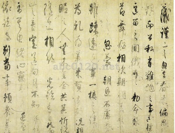藤原行蔵(九七二~一〇二七)は三跡の一人として知られ、和様の書の大成者として著名。その末裔はのちに世尊寺流と呼ばれ、書道を家業とする能書の家として一流をなし、尊崇を受けた。本作品は冒頭に草名の署名があり、行成の自筆書状として現存する唯一のものである。礼紙書を含む料紙二枚に認められた書状のうち、後半部分が散逸している。本文中一行目末から二行目にかけて「偏思赴鎮」とあり、五行目に「忽蒙 朝恩不慮昇進」とあることから、行成が大宰権帥から権大納言に昇進した寛仁四年十一月二十九日頃に出されたもので、行蔵四十九歳の手と推測される。書状とは思えないような均整美が感ぜられ、微妙な筆遣いが各所にみられる。自分の昇進を知人に報じたものだが、残念ながら宛所は不明。この書状には紫の雲紙の短冊形の添状かおる。「殊勝之権跡手本也、秘蔵者也、建武元年八月六日 尊円(花押)」とあり、尊円法親王(一二九八~一三五六)旧蔵であったことが分かる。