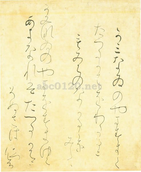 詞書の「かみなゐの云々」を三行に書写し、わずかに余白をとって、初句と二句を一行に、そして三句目の「あきなれば」で墨継ぎをして一字下げて書き進めている。穂先の利いた筆を円転自在にあやつって、優美で明るい書風と清楚な料紙の調和が見事である。出所:書の至宝-日本と中国2006