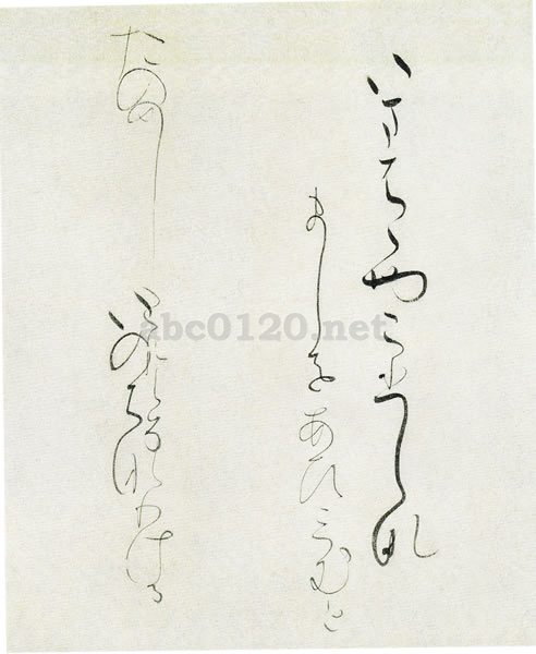 方形の空間に、墨をたっぷり含んだ筆をおろし、「いまはゝひしなましをあひみむと」と上句を執筆し、続いて余白を大きくとって「たのめこしことそ」と筆を進め、五句目「いのちなりける」を四句目にからませるように文字を重ねて和歌一首を書写する。