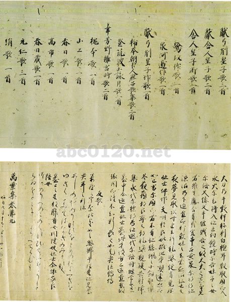 歌は万葉仮名と平仮名とで併記し、万葉仮名は行書にときおり草体をまじえ、仮名歌は一首二行書きに書写している。やや右肩上がりで、当代の仮名にみられる連綿の美しさとは異なり、個性的で荘重豪快な筆致であるのが特色で、院政時代初め頃の書写と推定される。本文は、継ぎ目箇所などに脱落があって、十紙半を存し、巻九の全体の約三分の二を存している.筆者を藤原公任(九六六―一〇四一)と伝えるが、公任自筆の「稿本北山抄」(京都国立博物館)とは異筆で、現在は、藤原行成(九七二―一〇二七)の孫の藤原伊房(一〇三〇―九六)とする説が有力である。伊房は速筆をもって知られるが、巻末の奥書には「始自九月十七日、至于廿日写之了」とみえ、わずか四日間で書写し終えていたことになる。出所:書の至宝-日本と中国2006