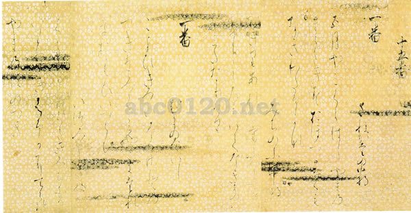 華麗な料紙の巻物に『後十五番歌合』を書写したものである。この歌合は『前十五番歌合』の影響のもとに、寛弘五(一○〇八)~六年頃に成立した。藤原公任(九六六―一〇四一)撰とする説が有力で、『拾遺抄』『麗花集』などから撰歌して、作成されたものである。「十五番」という十番出しで歌合が始まっていることから、前後二つの歌合を揃えたものではなく、 一巻の調度手本として調製されたものと考えられる。金銀の砂子や切箔・野毛で霞引きを施し、さらに梅花、花菱、紅葉、波、宝相華の各文様を雲母で摺り出したじつに美しい料紙で、国や文様などの料紙装飾から南北朝時代と推定される。