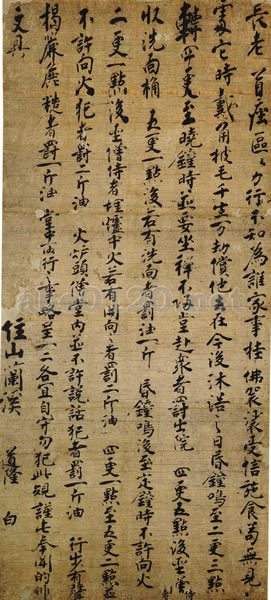 蘭渓道隆(大覚禅師、一二一三―七八)は、寛元四年(一二四六)来日し、本場中国の禅を伝えた中国・南宋時代の高僧。鎌倉幕府五代執権北条時頼(一二二七―六三)の帰依を受け、建長寺の初代住持となった。この作品は、それぞれ法語と規則の幅からなり、法語の幅では公案を一時たりとも忘れず参禅弁道につとめるべきこと、規則の幅では日々の修行を怠らぬよう戒め、もし怠ったり生活のきまりを破った場合の罰則が記され、その精神とともに建長寺の重宝として伝えられる。