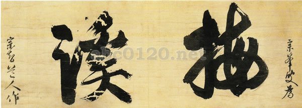 字号は追号ともいい、禅の修行がある段階に達すると、先輩や師からつけられたり、人々から呼ばれたりした。これは、宗峰妙超(大燈国師、 一二八二―一三三七)が宗智道人(未詳)に梅渓の号を与えたときの字号である。書体としてみれば、梅は草書体、漢は楷書の趣を湛えた行書体で書かれるが、筆者の力量によって紙上で一体化して違和感がない。すなわち、筆鋒鋭くかつ悠然とした筆致で、文字に存在感があり、気宇壮大で威厳に富む。梅渓の二字を執筆した後に書かれた為書きの「宗峯叟為」「宗智道人作」の二行をいったん視界から除いてみるとき、筆致から圧倒的な存在感が溢れていることに気づかされる。