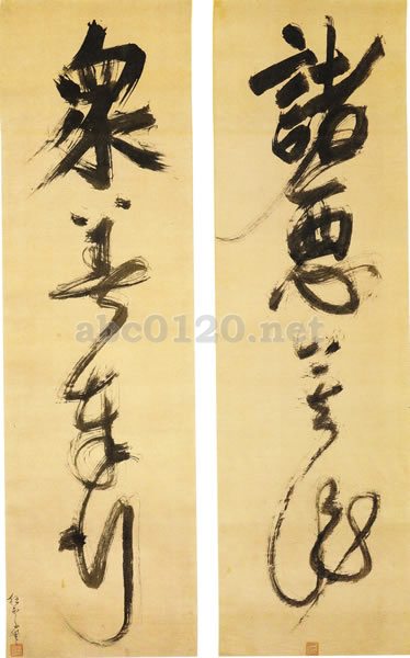 一休宗純(一三九四―一四八一)は、大徳寺第四十八世。紙面一杯にみなぎる筆力の強さと鋭さに加えて荒々しさのある野性味が感じられ、 一休の覇気がよくあらわれている。気迫に満ちた一休ならではの風格をもっており、その遺墨を代表するものである。この語は、釈迦の戒めの偈である七仏通戒偈「諸悪莫作、衆善奉行、自浄真意、是諸仏教」中の初めの二句をとり、 一句ごとに一行に大書した双幅である。