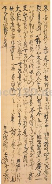 これは、 一休が最も尊敬する人物の一人である大燈国師の上堂、すなわち、法堂にのぼって法を説いた語を揮毫したものである。運筆の緩急、行のうねりや余白などからは、 一休の卓越した書才を偲ぶことができ、彼の書の魅力を遺憾なく発揮したものといえよう。落款の「狂雲子」はその号。出所:書の至宝-日本と中国2006