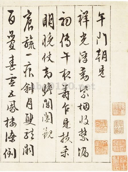 この作品は、文徴明(一四七〇―一五五九)嘉靖三十六年の作で逝去の二年前の作品である。趙孟頫(一二五四―一三二二)の書法の清雅な趣が表現されている。「文徴明」(白文印)と「停雲」(朱文円印)、「衡山」(朱文印)が押されている。