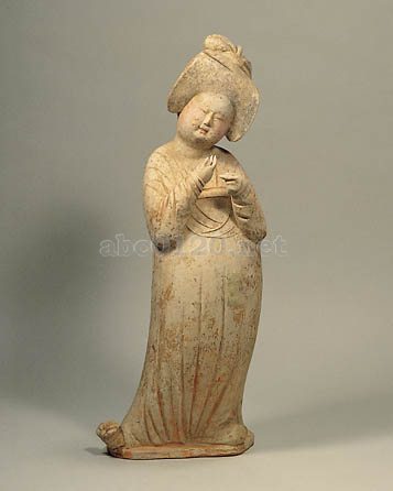 大きく結いあげた髷の切れこみにはかんざしが、胸の前にかかげた手の指先には小鳥がとまっていたらしい。素焼の塑像の表面に胡粉(ごふん)を塗りつめ、その上から泥絵具で彩色してあったが、土中で色はほとんど剥落している。唐時代にはこのような加彩のほか三彩による俑も多い。若い女性の初初しさが余すところなく捉えられ、数ある婦女俑のなかでも屈指の名作として知られている。