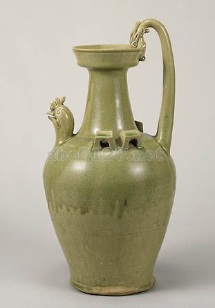 天鶏壺は龍形の把手に、鶏の頭部を象った注口をもつ耳付きの盤口壺(ばんこうこ)で、東晋から初唐にかけて流行した。注口が単なる飾りのものも多いため、一般に明器(めいき)であると考えられている。本作品に見られる、すらりと引き締まった頸部や勢いのある龍柄、そして鶏頭及び胴部の張りのあるダイナミックな造形感覚は、山西省太原北魏辛祥墓(520年)など北朝墓の出土例に近く、6世紀前半頃のものとみなされる。ただ、その生産地についてはまだ確定できない。細かな貫入のあるガラス質の強い釉薬が、やや白味がかった素地上に胴の中ほどまで二度がけされており、所々の釉だまりが美しい。出光美術館やMOA美術館の作例とならぶ天鶏壺の大作である。