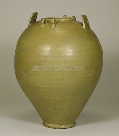 晩唐から五代にかけて、浙江省を中心に分布した越州窯では、「秘色(ひそく)青磁」を筆頭にいわゆる古越磁とは異なる新たなタイプの青磁が生産された。実用器皿の量産と製品流通機構の整備を背景とし、この時期の越州窯青磁は国内はもとより遠く海外にまで運ばれた。インドネシアのセレベス(スラウェシ)島で出土し、当地の国王が秘蔵していたと伝えられるこの壺は、そうした輸出陶磁器のひとつである。壺の内外に施された青磁釉は、失透性で、黄味がかった独特の発色を見せる。所々に生じた釉ムラは、轆轤目を残す素朴で力強い造形とあいまって、この壺に深い味わいを与えている。二つの板耳と四つの環耳は本来伴っていた蓋を留めるためのもので、江蘇省蘇州七子山五代墓からは蓋付の類品が出土している。
