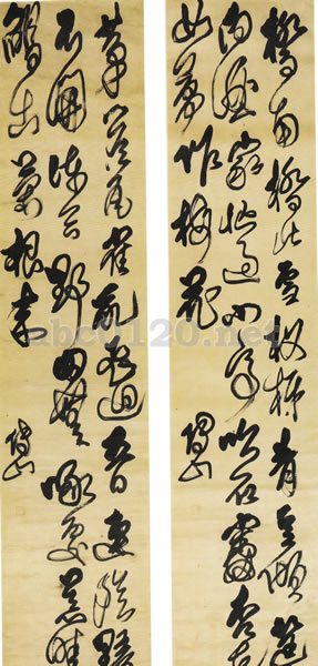 人々が熟知している傅山(一六○七-一六八四)の作品とは、この種の流れるような連綿草の軸作品である。こうした書風は、明末以来の技法からの脱却と個性重視の精神によるもので、その発展の極致ともいうべきものである。同様に狂草をもって世に称せられ、書きぶりの謹厳な王鐸(一五九二~一六五二)と比べてみても、傅山の草書は形態、点画すべてにわたって規矩にこだわらず、大筆、濃墨で縦横に書きめぐらしている。これは傅山の、癲狂不羈なる人格の表現ともいえる。各幅すべてに「傅山」と記し、「傅山」(朱文印)が押されている。出所:書の至宝-日本と中国2006