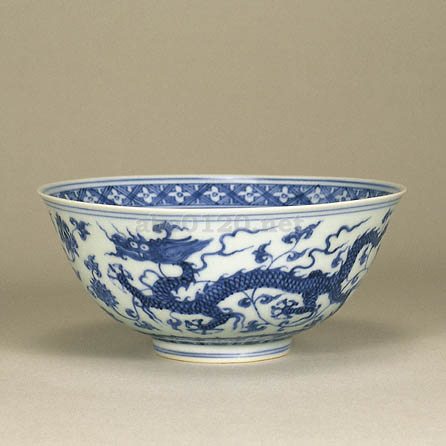 成化年間に現われた薄作りで小形の碗の延長線上にあると思われるが、文様表現は一転して繁縟さを増している。外側には宝相華(ほうそうげ)唐草をともなう一対の龍の姿を、内側は側面に蔓唐草文を、底部に蓮池文を描く。文様は細い描線で余白をあまり残さず緻密に描かれている。一方で龍の肢体や唐草の蔓の動き、葉や花弁の形などには図式化の傾向が見られる。また、口縁部や内底に見られる細かい装飾には、次の嘉靖万暦期の文様との関連がうかがえる。