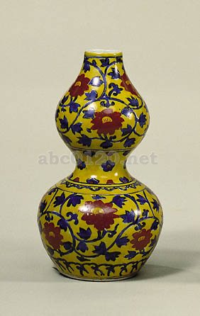 明・清|陶磁器|>黄地青花紅彩牡丹唐草文瓢形瓶(「大明嘉靖年製」銘) |