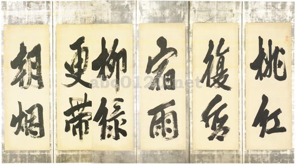 この作品は、唐の詩人王維の自撰になる『王右丞詩集』巻第十四の田園楽七首に所収の一首を、六曲一双屏風の二扇に二字あて大書したものである。その雄渾な書は、能書として喧伝された親和の現存遺墨の中でもその特徴を最もよく示した最高傑作と考えられる。出所:書の至宝-日本と中国2006