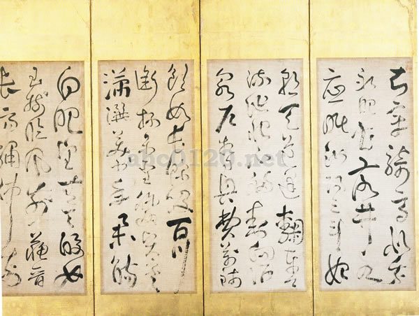 これは、池大雅(一七二三-七六)が唐の詩入杜甫の詩「飲中八仙歌」を揮毫したものを、八曲屏風に仕立てたもの。この詩の八仙とは、李白・賀知章・李適之・崔宗之・汝陽王李璡・蘇普・張旭・焦遂のこと。こよなく酒を愛しまた愛された八人の酔趣を彷彿させる古詩として古来著名である。池大雅は文人画家として知られるが、書にも才能を発揮し、古典に学び、篆・隷・楷・行・草の各書体をよくした。同時代の柴野栗山によれば、とくに草書に優れたとの評がある。その書は、気宇壮大な書風で脱俗の趣にとみ、この作品は大雅の遺墨中でも出色のできを示す。「三岳道者(大服の号)酔書」という落款からは、大雅もともに酔郷に遊んでいることがうかがわれる。出所:書の至宝-日本と中国2006