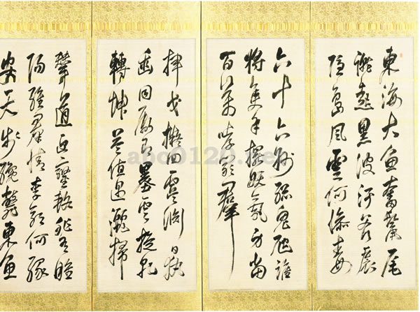 寛政九年(一七九七)、十八歳の頼山陽(一七八〇-一八三二)は叔父杏坪に伴われて江戸に遊学し、昌平常黌教授である尾藤二洲に師事することになった。故郷の広島を三月十二日に出発し、江戸までは約一ケ月の旅程となった。竹原で先祖の墓参をすませて、山陽道を東上し、三月二十三日摂津に入り、一ノ谷から源平の古戦場を眺め「一谷懐古」という長古詩を創作したといわれている。次いで兵庫湊川の楠木正成(一二九四-三三六)の墓に参り、建武三年(一三三六)に足利尊氏・直義との湊川の戦いで討死した正成の波乱に富んだ生涯を、七言律詩二首で詠じた。本屏風は、このときの初稿をもとにして揮毫したもので、のち改作の筆を幾度か加えたようで、文政七年(一八二四)に再度、墓参したとき、七言古詩として定稿としたが、初稿とは、かなりの異同がみられる。山陽の場合は、たとえば「喀血詩」のように、一度作詞したものでも、自ら気に入るまで、何度も推敲を重ねたことが知られる。この作品は、詩人、儒者であった山陽の実力を遺憾なく発揮した書として注目される。出所:書の至宝-日本と中国2006