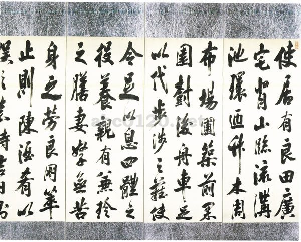 「楽志諭」は、後漢の仲長統(一七九-二二〇)の作で、時勢を批判して王朝への出仕を快しとせず、この一文を草して、悠々自適を唱え、自己の自由、尊重を強調している。本屏風は、末尾に「右録伸公理楽志論時徒維(己)大淵献(亥)暢月」とあり、天保十年(己亥)一月、米庵六十一歳の筆と知られる。収蔵家・書学者として、おびただしい資料と独自の書学に裏付けられた米庵の人柄がうかがえる、雄渾な書風を伝えている。出所:書の至宝-日本と中国2006