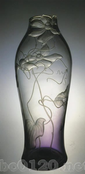 1900年以降 ハラホフ・ガラス工房 ノヴィー・スヴェット 高さ31.5cm 国立工芸美術館, プラハ 無色で紫の濃淡のあるガラス,エングレーヴィングによるクレマチス(花)文装飾。出所:『ボヘミアのアールヌーヴォーグラス展』 Bohemian Art Nouveau Glass